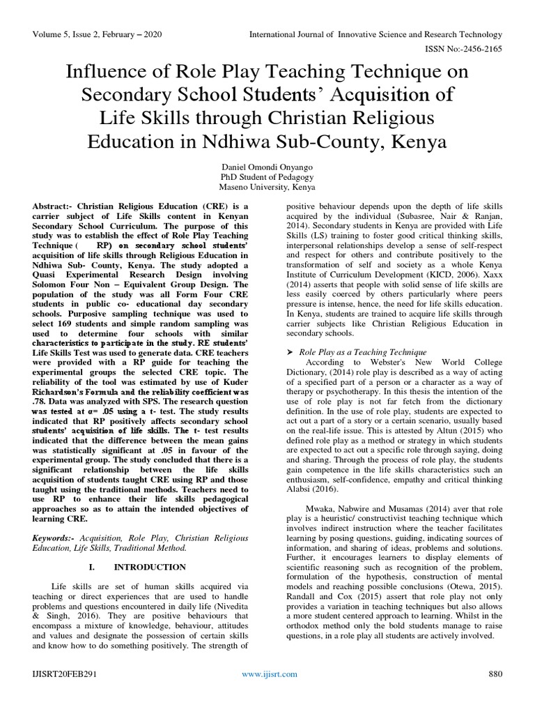 Life Skills Test was used to generate data. CRE teachers               Role Play as a Teaching Technique