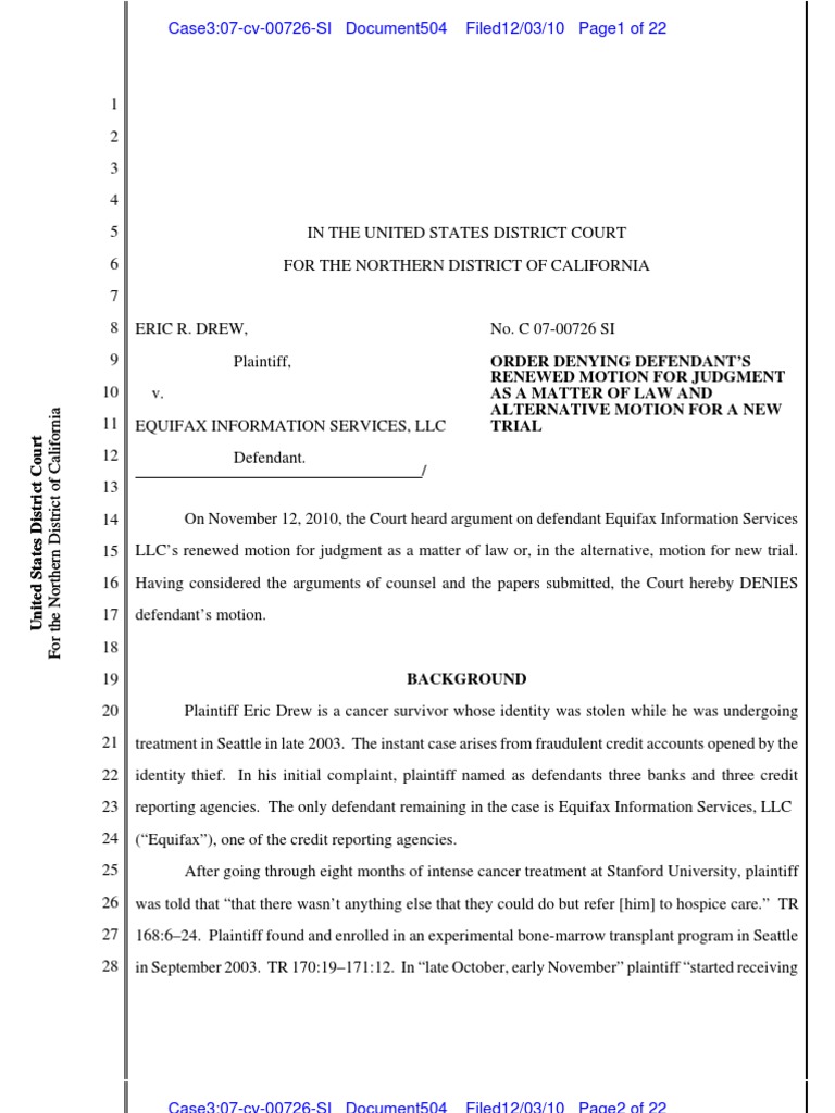Drew v. Equifax, C07-00726 SI (N.D. Cal. Dec. 3, 2010)