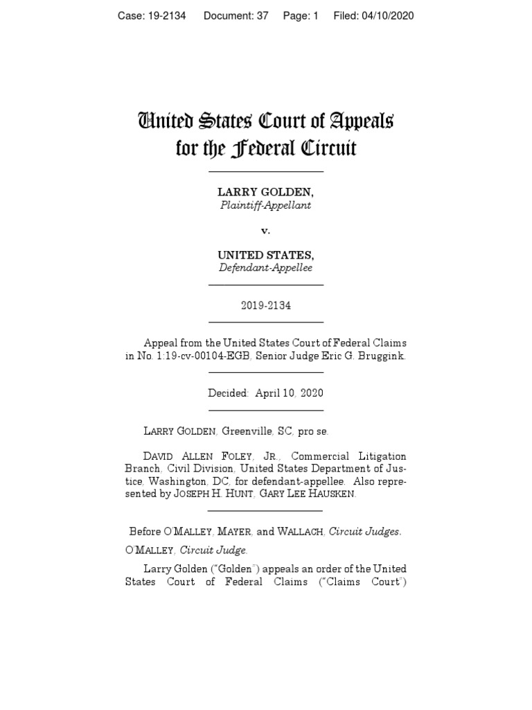 Golden v. United States, No. 19-2134 (Fed. Cir. Apr. 10, 2020)