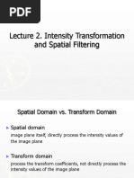 The document discusses various image enhancement techniques in spatial domain. It describes point processing techniques like linear, logarithmic and power law transformations that are used to enhance images. These transformations map pixel values of the input image to new pixel values of the output image to improve contrast. Thresholding and contrast stretching are also summarized as common point processing techniques used for image segmentation and enhancing low contrast images respectively.