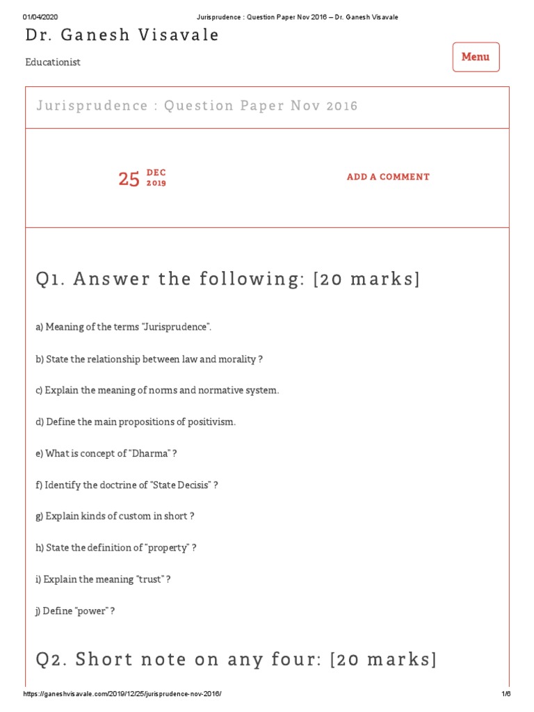 01/04/2020 Jurisprudence : Question Paper Nov 2016 – Dr. Ganesh Visavale