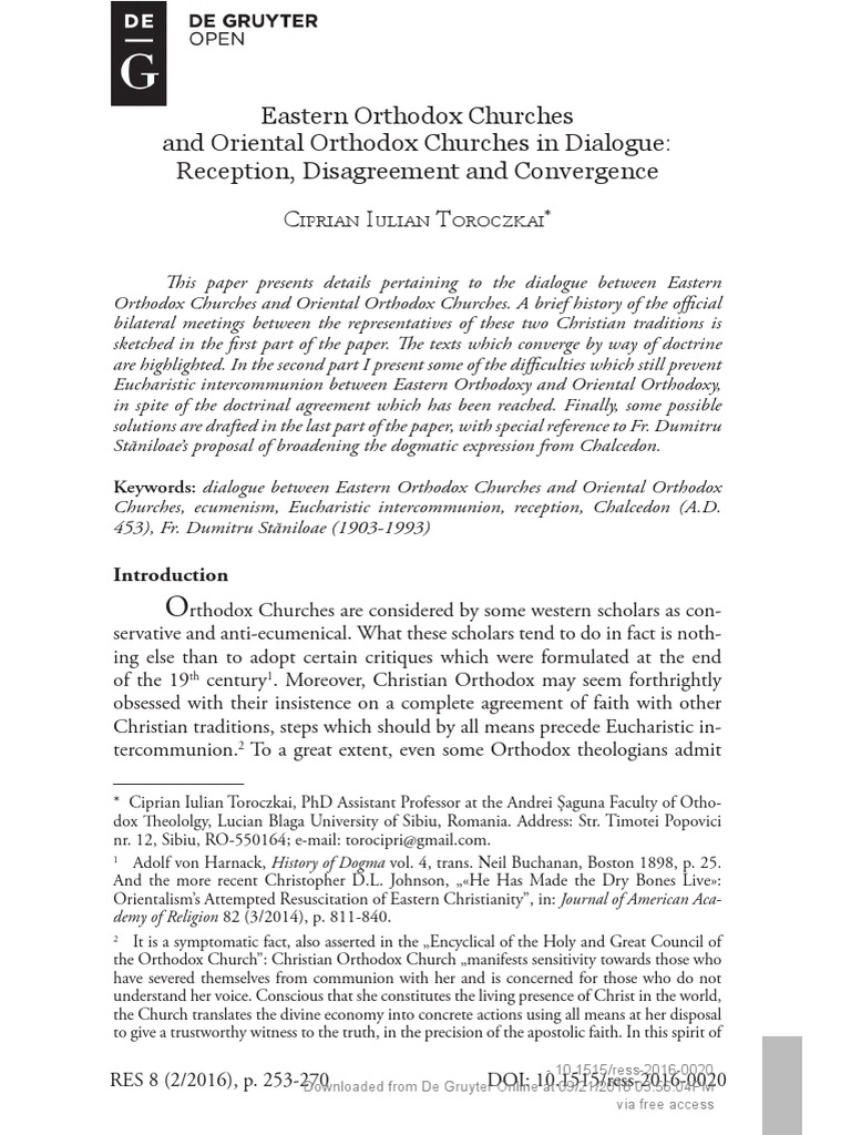 This paper discusses the dialogue between Eastern Orthodox and Oriental Orthodox churches. It provides a brief history of official bilateral meetings between representatives of the two traditions since the 1960s. These meetings highlighted areas of doctrinal agreement, particularly regarding Christology. However, difficulties preventing Eucharistic intercommunion remain, such as differences in views on certain church councils. The paper explores potential solutions to further the reception of dialogue results, such as proposals from the Romanian theologian Dumitru Stăniloae.