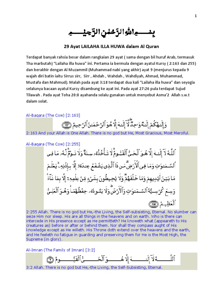 Tha marbutah) “Lailaha illa huwa” ini. Pertama ia bermula dengan ayatul Kursy ( 2:163 dan 255)