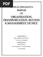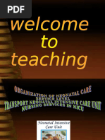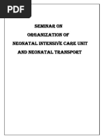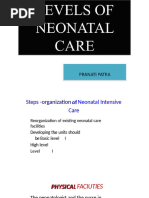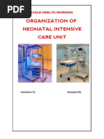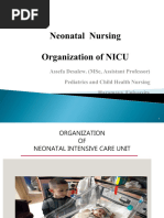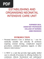 The document outlines the key equipment, supplies, layout, documentation, and education programs needed for a neonatal intensive care unit (NICU). The NICU should be equipped with incubators, ventilators, infusion pumps, monitors, and phototherapy units. Disposable supplies like IV catheters and feeding tubes are also required. The layout includes areas for nursing station, special care rooms, lab, and isolation rooms. Documentation includes maintaining admission/discharge records and analyzing data to improve care. Education involves continuing medical training for physicians and nurses on critical care procedures.
