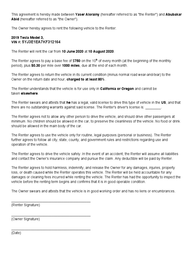 This agreement is hereby made between Yaser Alorainy (hereafter referred to as "the Renter") and Abubakar