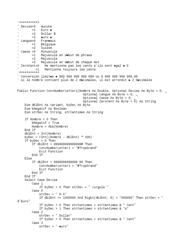 Public Function ConvNumberLetter1(Nombre As Double, Optional Devise As Byte = 0, _