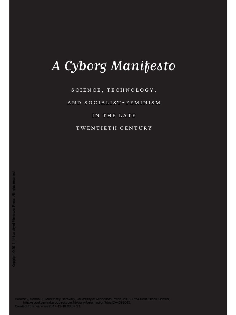 A Cyborg Manifesto: Science, Technology, and Socialist-Feminism in The Late Twentieth Century