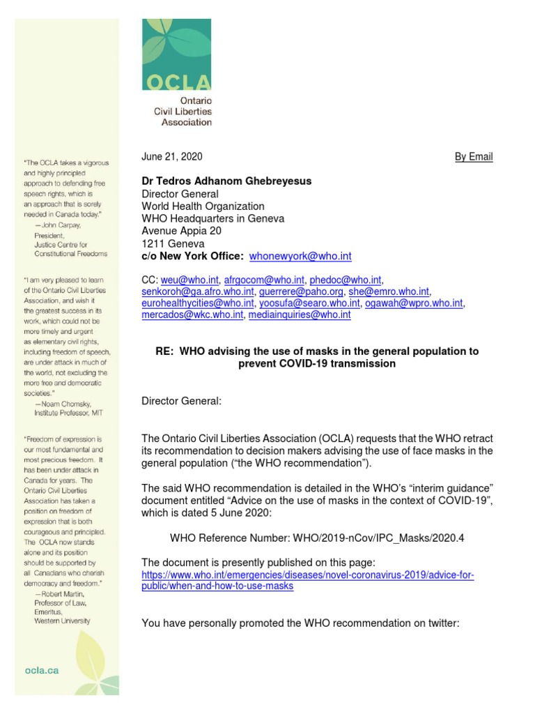The Ontario Civil Liberties Association (OCLA) requests that the WHO retract