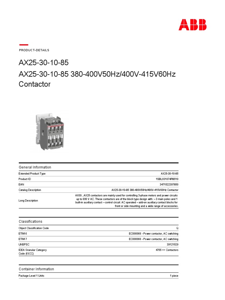Catalog Description AX25-30-10-85 380-400V50Hz/400V-415V60Hz Contactor