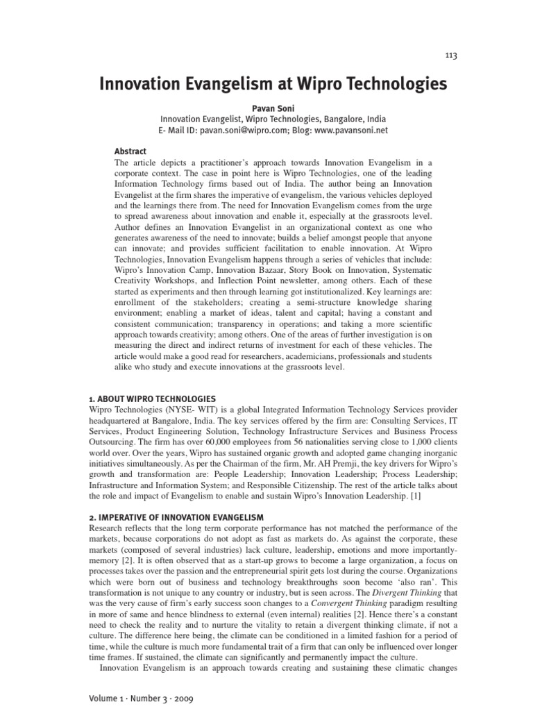 the role and impact of Evangelism to enable and sustain Wipro’s Innovation Leadership. [1]