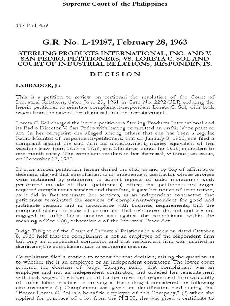 Judge Tabigne of the Court of Industrial Relations in a decision dated October