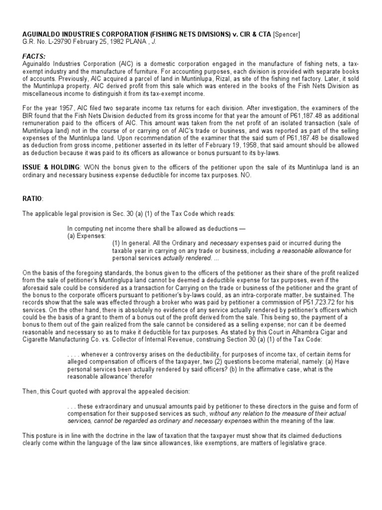 Aguinaldo Industries Corporation (AIC) is a domestic corporation engaged in the manufacture of fishing nets, a tax-