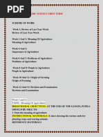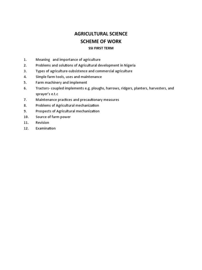 This document outlines the scheme of work for the Agricultural Science course over three school terms for Senior Secondary School Year 1 (SS1). The first term covers topics such as the meaning and importance of agriculture, types of agriculture, farm tools and machinery, and crop husbandry. The second term focuses on land and soil, crop husbandry of various plant types, and the third term covers livestock management, pasture crops, irrigation and drainage. Similar outlines are provided for the SS1, SS2, and SS3 years with increasing specialization in topics such as genetics, animal health, aquaculture, economics and extension services.