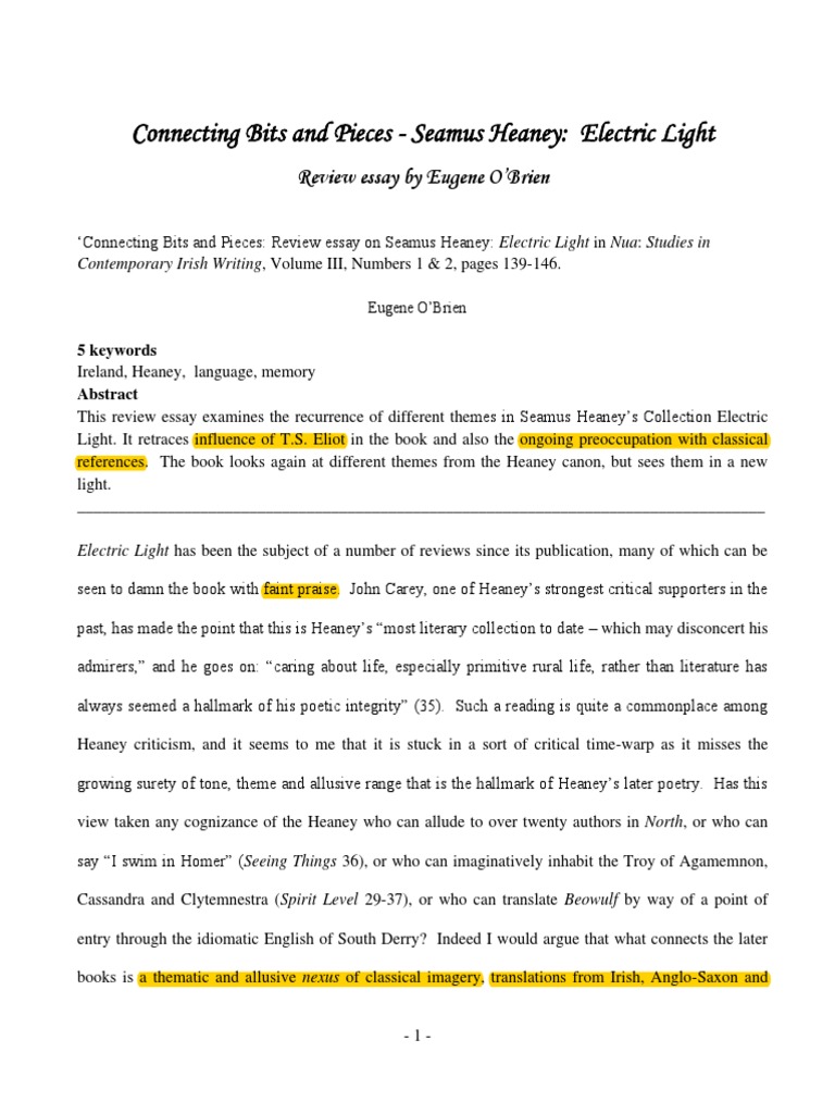 Connecting Bits and Pieces - Seamus Heaney: Electric Light