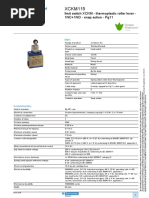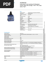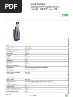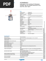 This document provides product data and specifications for the XCKMR54D1H29 limit switch. The limit switch has a rotary head, a stay put crossed rods lever, two normally closed contacts per direction, and is intended for hoisting and mechanical handling applications. Key specifications include IP66 protection, operating temperature range of -25°C to 70°C, mechanical durability of 2 million cycles, and compliance with various industry standards.