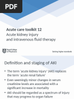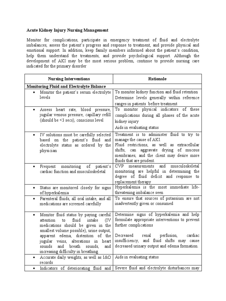 The document outlines nursing management for patients with Acute Kidney Injury (AKI), emphasizing the importance of monitoring fluid and electrolyte balance, reducing metabolic rate, promoting pulmonary function, preventing infection, and providing psychosocial support. It includes specific nursing interventions and rationales for each action, highlighting the need for careful patient assessment and family involvement. Additionally, it addresses gerontologic considerations and nutritional therapy to support recovery.