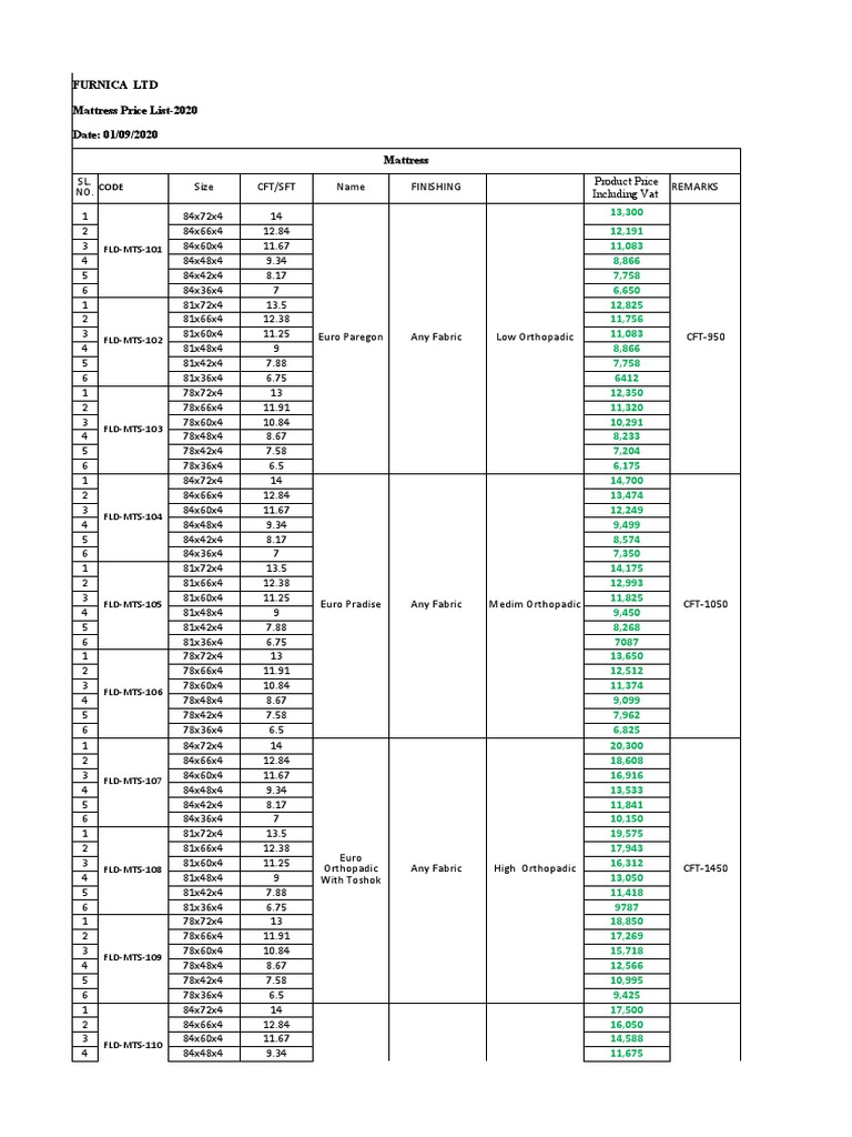 Furnica LTD Mattress Price List-2020 Date: 01/09/2020 Mattress