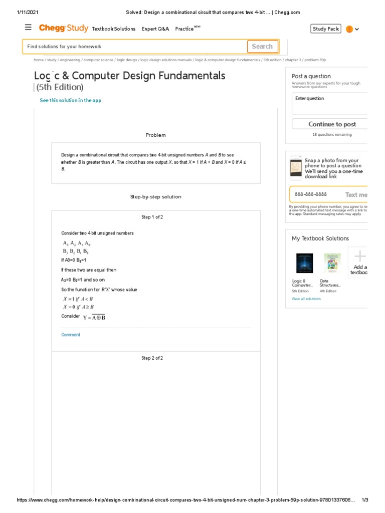 1/11/2021 Solved: Design a combinational circuit that compares two 4-bit ... | Chegg.com
