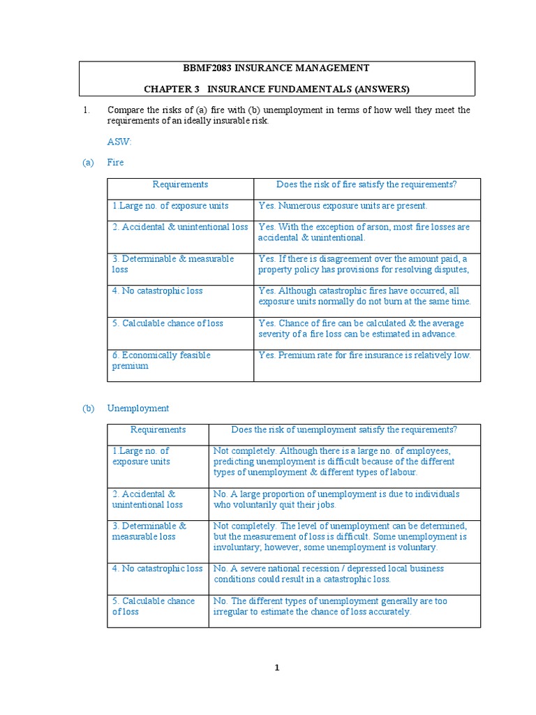 1. Compare the risks of (a) fire with (b) unemployment in terms of how well they meet the