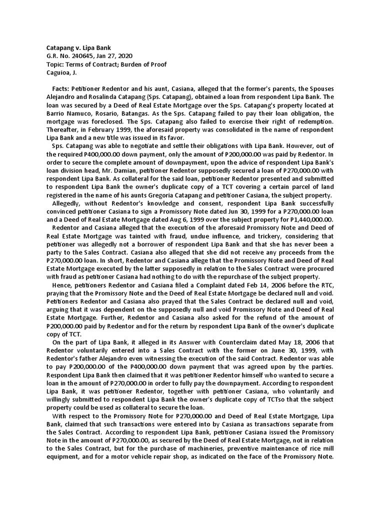 Alejandro and Rosalinda Catapang (Sps. Catapang), obtained a loan from respondent Lipa Bank. The
