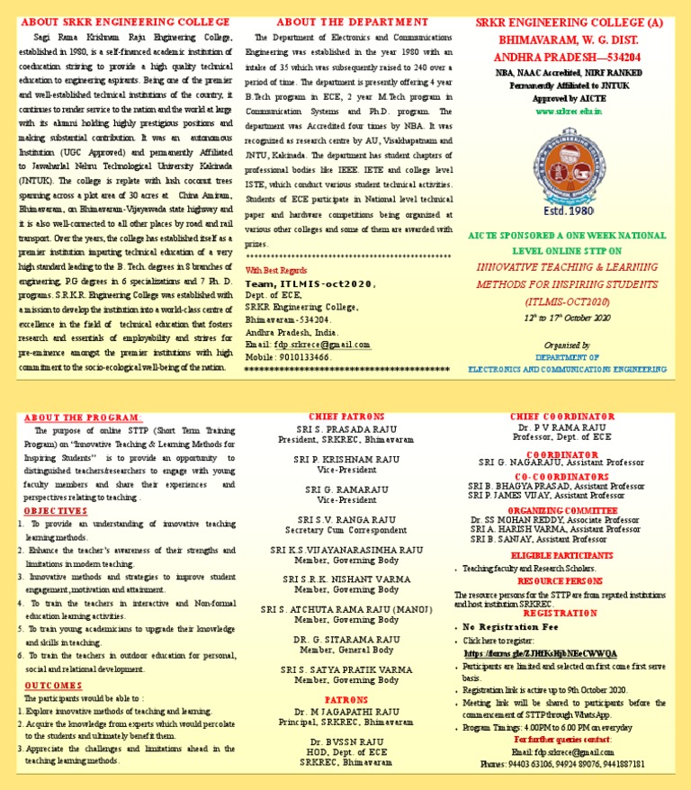 The document provides information about an online short term training program on innovative teaching and learning methods organized by the Electronics and Communications Engineering department of SRKR Engineering College. The program aims to provide an understanding of innovative teaching methods and strategies to improve student engagement. Eligible participants include teaching faculty and research scholars. The program will be conducted from 12th to 17th October 2020.
