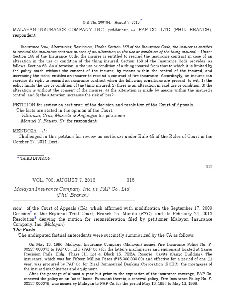 Rosario, Cavite (Pace Pacific). Contesting the denial, PAP Co. argued that Malayan cannot avoid