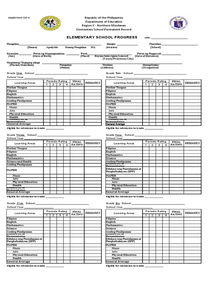 This document is a DepEd Form 137-E, which is an elementary school permanent record form from the Philippines. It contains information about a student named Terresa Maria Leonora such as her biographical details, parents/guardians, schools attended, and periodic and final ratings for various learning areas from Grade 1 through Grade 6.