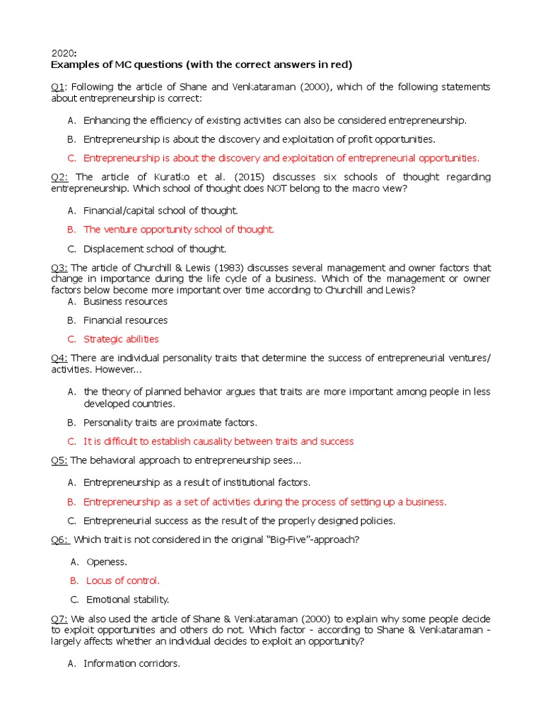 Q4: The article of Kuratko et al. (2015) discusses six schools of thought regarding entrepreneurship.