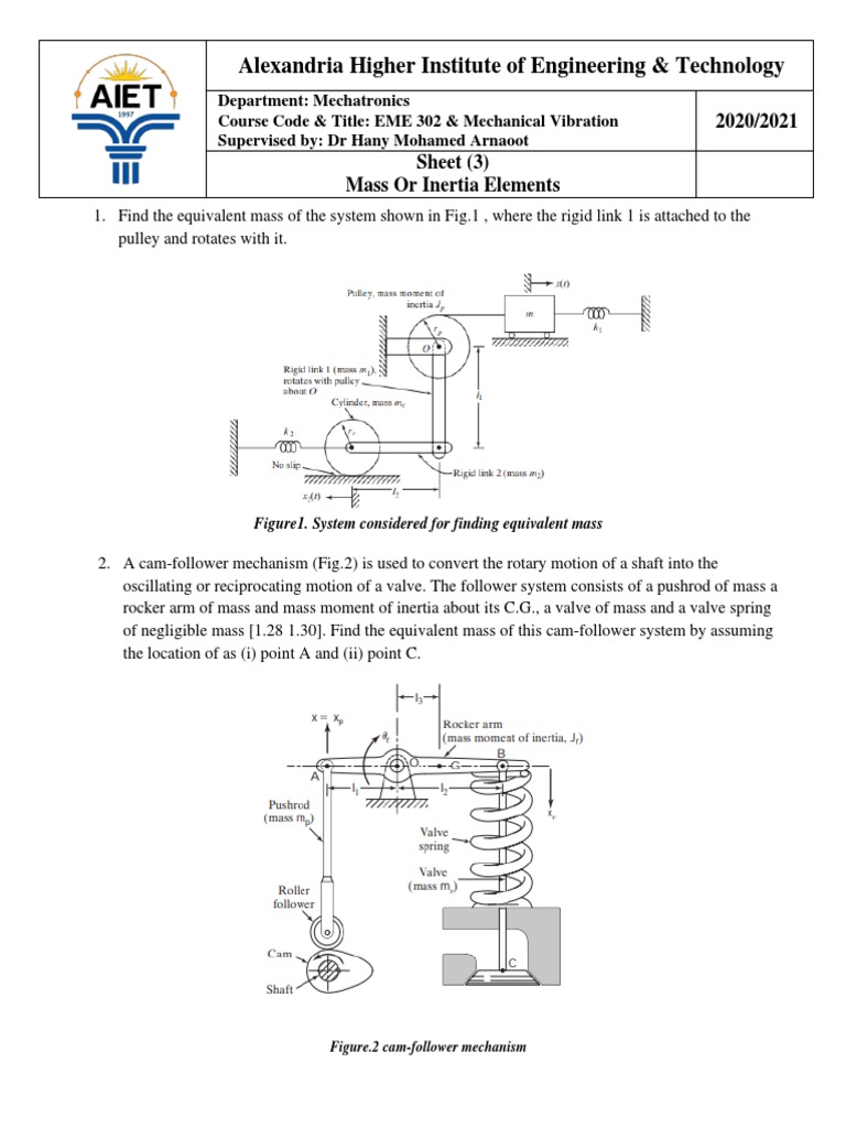 1. Find the equivalent mass of the system shown in Fig.1 , where the rigid link 1 is attached to the