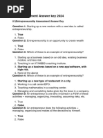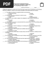 This document contains a practice test for students in Technical-Vocational Livelihood Education (TLE) with questions about entrepreneurship, business management, and marketing. The test has five sections: I) matching terms, II) identifying entrepreneurial competencies, III) multiple choice, IV) solving a math problem to calculate selling price, and V) answering an essay question about how to be a good business owner. The test evaluates students' understanding of key concepts like the steps of market research, factors in discovering business opportunities, and definitions of entrepreneurship, planning, and market control.