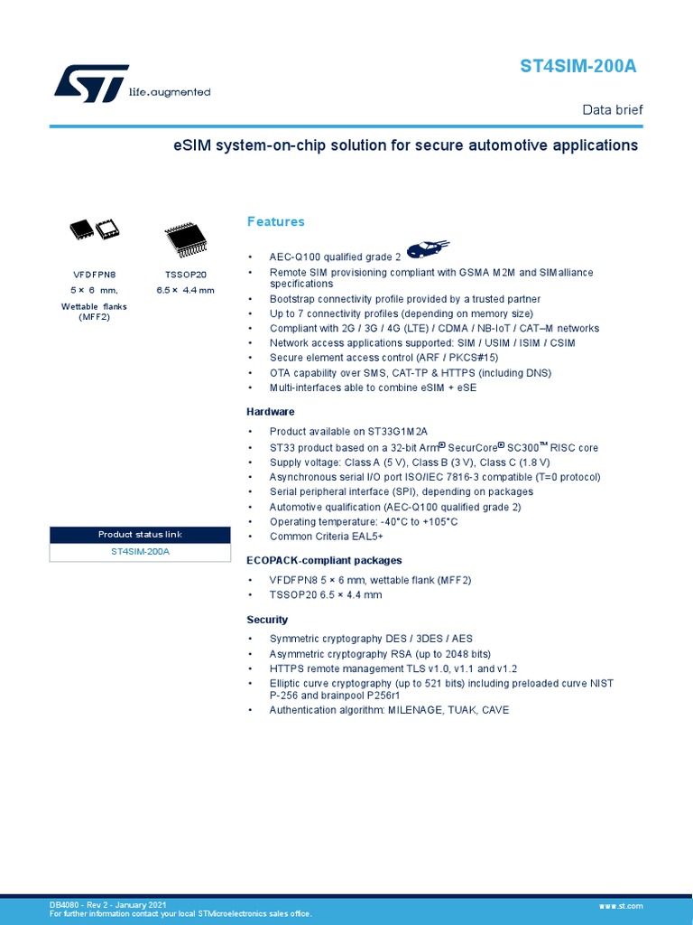 The device is based on the ST33G1M2A, an automotive grade hardware solution, AEC-Q100 qualified grade 2