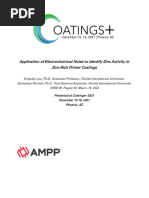 The document discusses an investigation into improving the corrosion protection properties of an epoxy zinc-rich coating by partially replacing zinc particles with lamellar aluminum and micaceous iron oxide particles. Electrochemical noise, electrochemical impedance spectroscopy, and salt spray testing were used to evaluate the coatings. Results showed that partial replacement of zinc with these barrier particles enhanced the corrosion protection of the coating without reducing its sacrificial properties, with the micaceous iron oxide loaded coating demonstrating better performance than the aluminum loaded coating.
