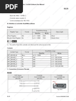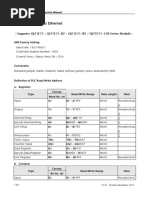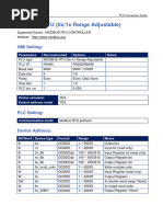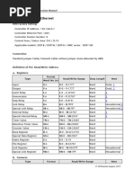 This document provides information for connecting a Delta HMI to a Delta DVP TCP/IP controller. It lists the default factory settings for the controller IP address, COM port, and station number. It also specifies the control and status areas in registers D0 and D10. Connection can be made with either a standard jumper cable or network cable. The document defines the valid read and write ranges for various register and bit types like X, Y, M, S, T, C, and D registers. Addresses must be multiples of 16.