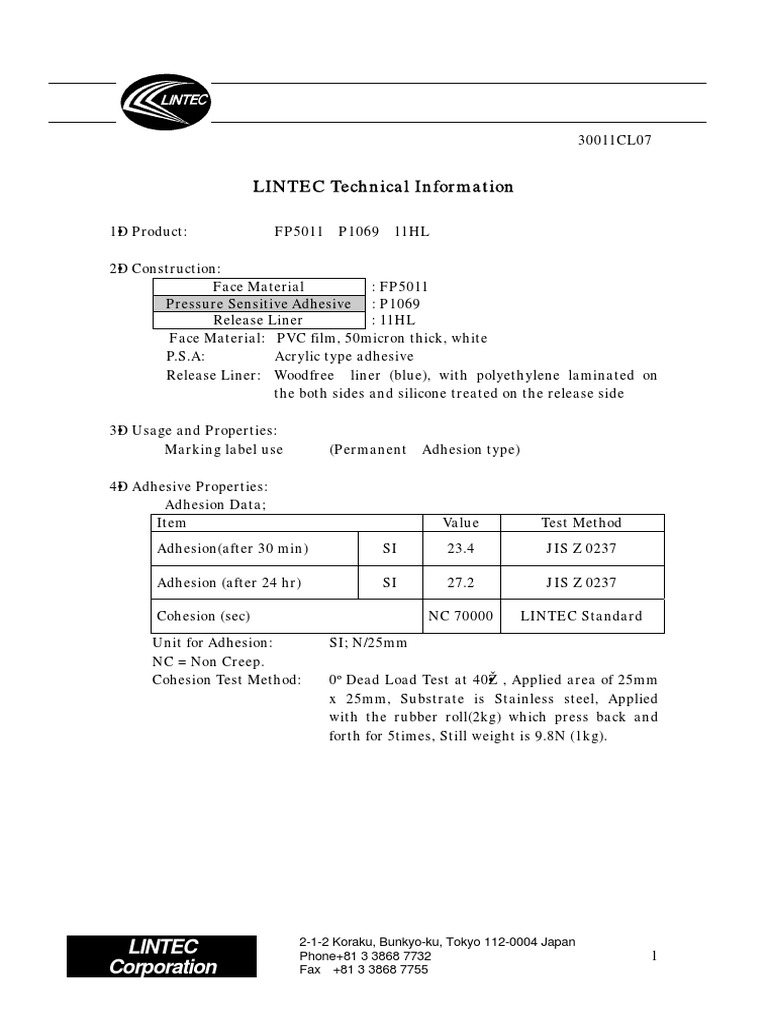 Adhesion(after 30 min) SI 23.4 JIS Z 0237