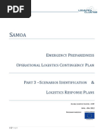 This document provides Tonga's operational logistics contingency plan for emergency preparedness. It identifies potential emergency scenarios for Tonga, including cyclones, floods, volcanic eruptions and earthquakes/tsunamis. It outlines Tonga's emergency procedures and the roles of key agencies in responding. The document then provides two logistics contingency plans, for a medium impact and worst case scenario, detailing the logistics response procedures, work plans, and preparedness measures for each.