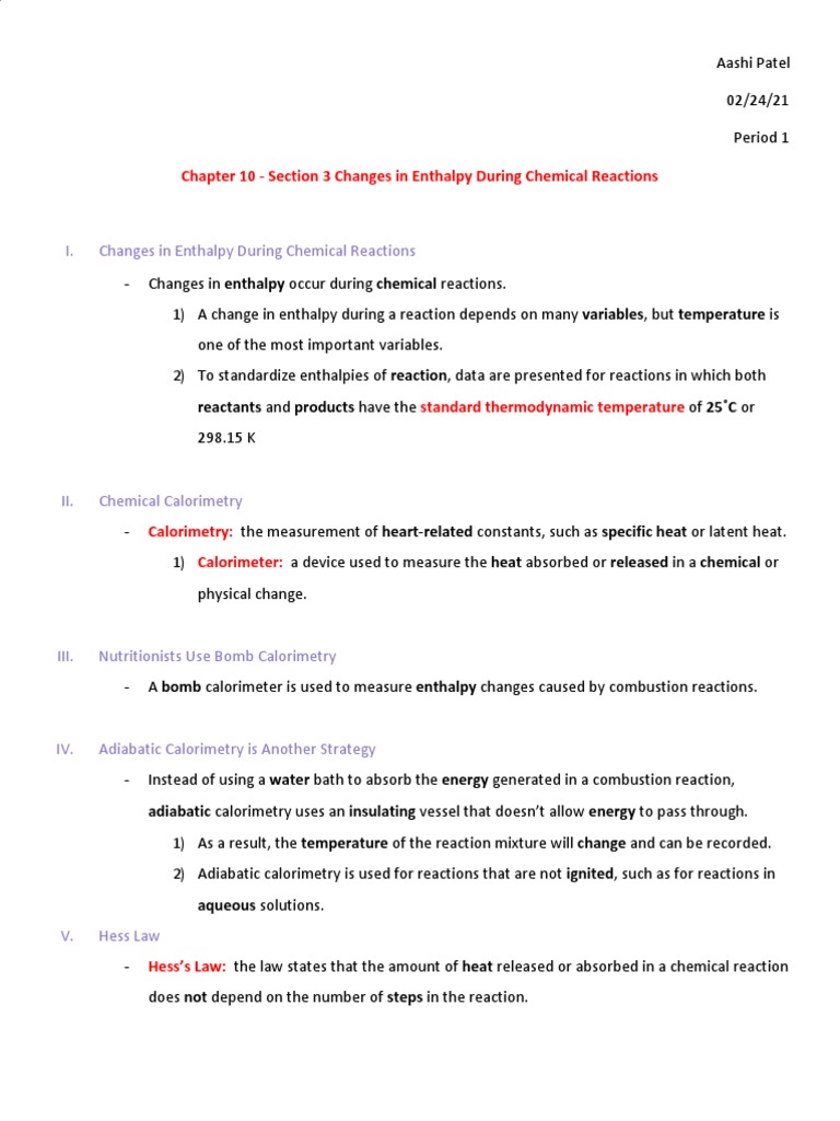 I. Changes in Enthalpy During Chemical Reactions