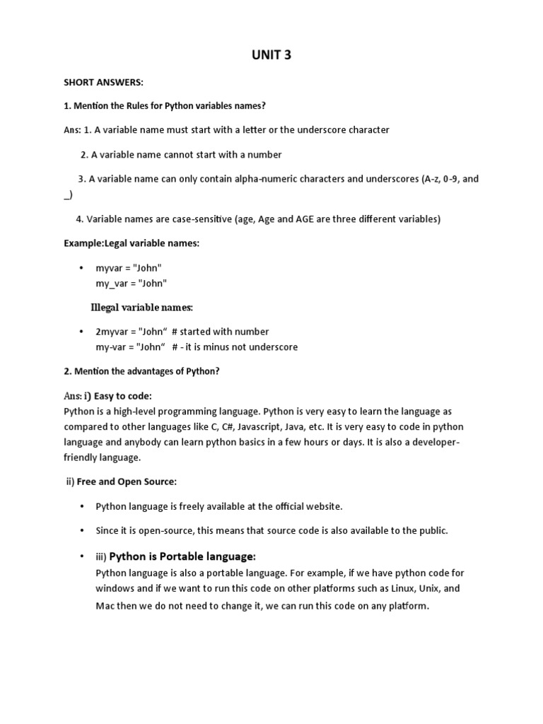 The document provides answers to various questions related to Python. It discusses the rules for Python variable names, advantages of Python like being easy to code, free and open source, portable etc. It provides examples of range function, reading and writing CSV files. It also discusses random module and provides short notes on data types in Python with examples of int, float, string, list, tuples and dictionaries. Finally, it explains exception handling in Python with an example and discusses Python functions and modules with examples of defining, calling and using arguments in functions.
