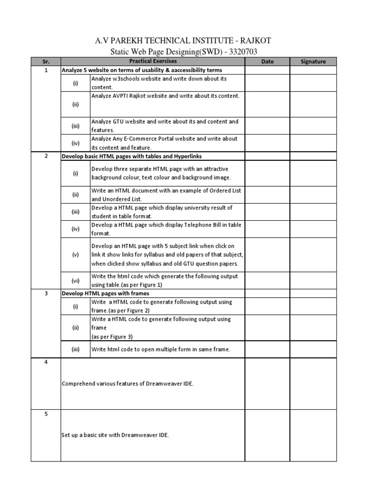 Sr. Practical Exercises Date Signature