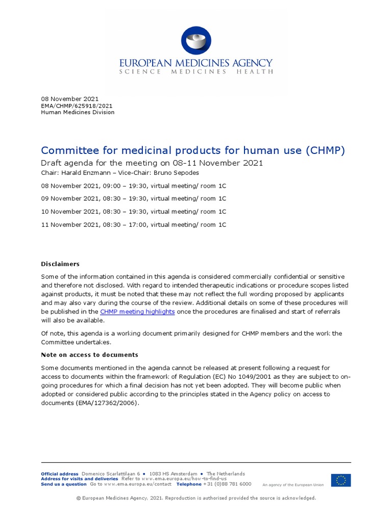Of note, this agenda is a working document primarily designed for CHMP members and the work the