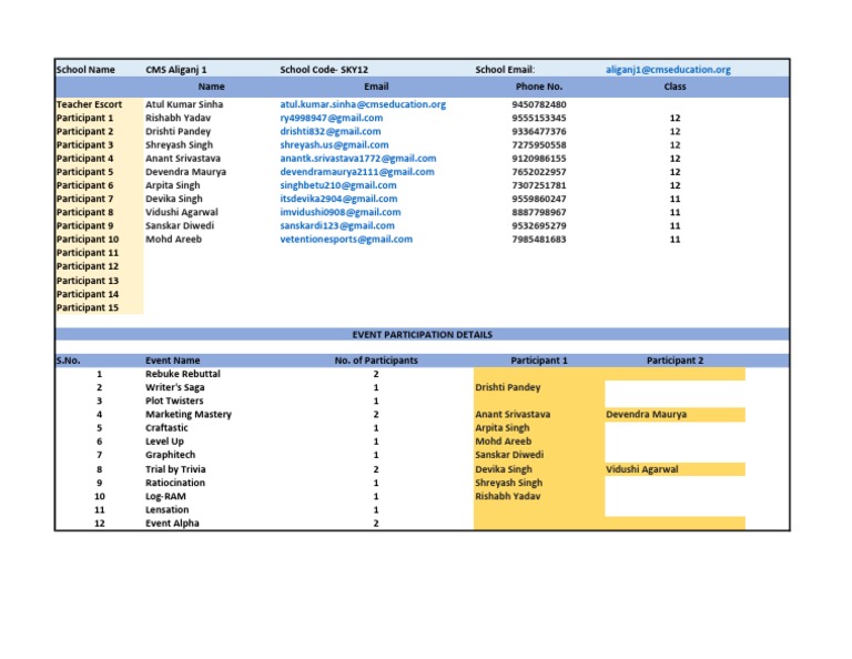 S.No. Event Name No. of Participants Participant 1 Participant 2