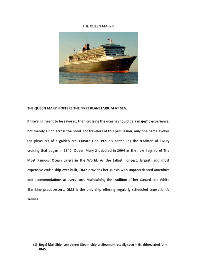 RMS Queen Mary 2 is a transatlantic ocean liner. She was the first major ocean liner built