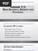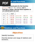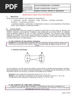 The document is a lesson on functions that defines functions, provides examples of functions and non-functions, and discusses function notation and domains. It defines a function as a correspondence between a domain and range that associates each domain element to a unique range element. It provides examples of one-to-one, many-to-one, and one-to-many relations and whether they are considered functions. It also discusses function notation including domains, ranges, and the correspondence or machine. It provides examples of interval, roster, and set-builder notation for specifying domains.