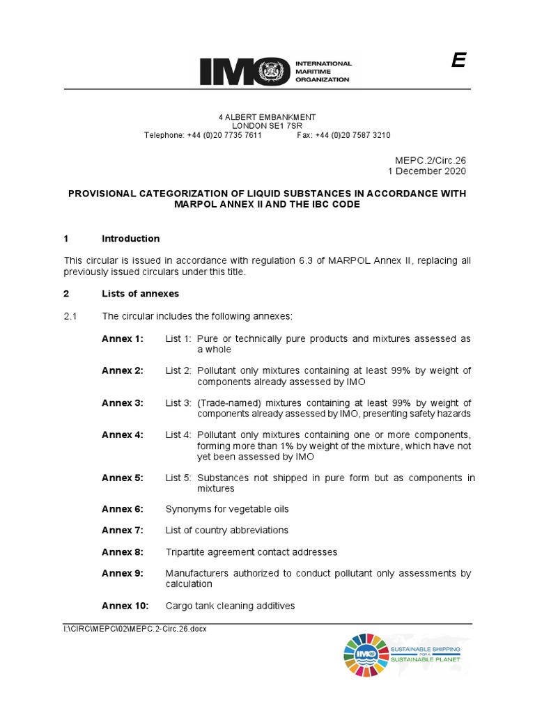 This circular is issued in accordance with regulation 6.3 of MARPOL Annex II, replacing all