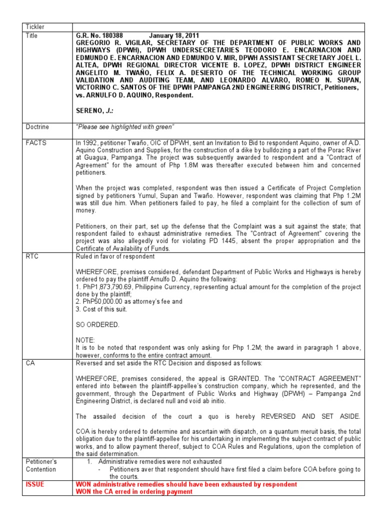 FACTS In 1992, petitioner Twaño, OIC of DPWH, sent an Invitation to Bid to respondent Aquino, owner of A.D.