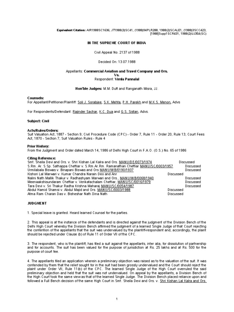 Suit Valuation Act, 1887 - Section 9; Civil Procedure Code (CPC) - Order 7, Rule 11 - Order 20, Rule 13; Court Fees