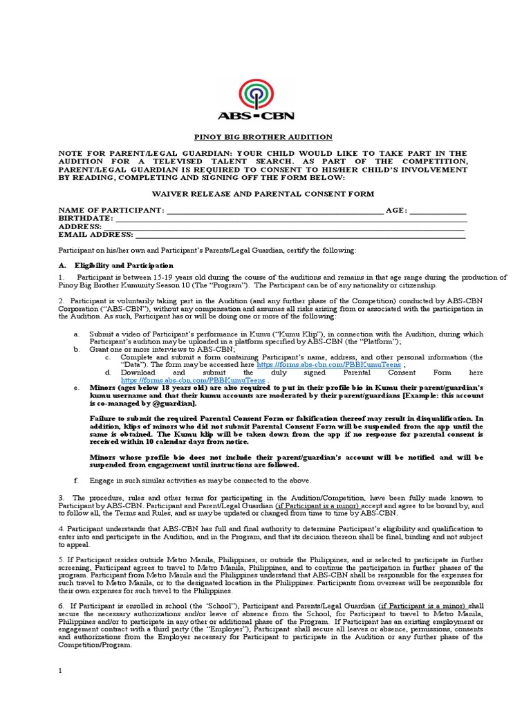 ABS-CBN, or violate any of their undertakings, warranties or obligations in this Waiver Release (and Parental Consent) Form,