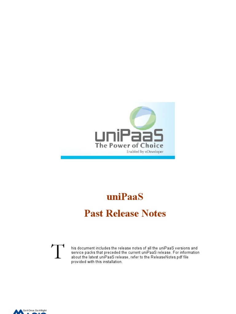 his document includes the release notes of all the uniPaaS versions and service packs that preceded the current uniPaaS release. For information about the latest uniPaaS release, refer to the ReleaseNotes.pdf file provided with this installation.