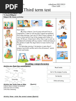 This document contains a reading comprehension test about a 12-year-old boy named Abderrazak who lives in Blida, Algeria. He attends EL-MEHDI Mohamed Middle School. The test has several tasks: 1) Color the correct answers about Abderrazak and what time his mother gets up. 2) Fill in a table with his mother's daily activities and the times she does them. 3) Mark statements about Abderrazak as TRUE or FALSE. 4) Reorder words to form coherent sentences. 5) Conjugate verbs in sentences. 6) Pronounce and classify words from the text. 7) Write a paragraph describing