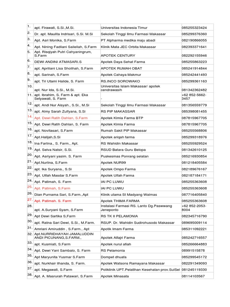 38. Apt. A. Masrurah Patawari, S.Farm Apotek Minasata 08114103567