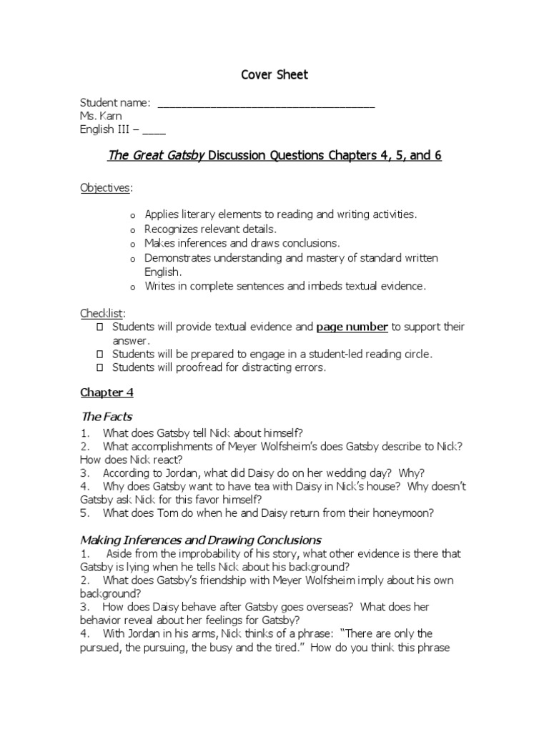 The Great Gatsby Discussion Questions Chapters 4, 5, and 6